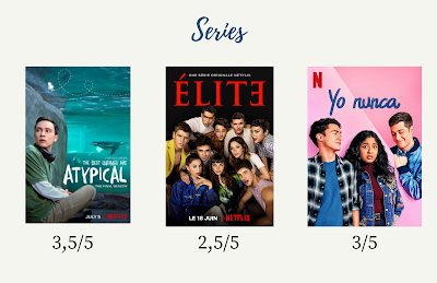 Por ultimo está Yo nunca, esta serie la amé y me reí mucho en las primeras temporadas pero en esta como que se desinfló, tiene aun su toque comedia que me gustó, pero esta vez se centraron demasiado en los dramas amorosos de la protagonista y no me agradó. Es una buena temporada para pasar el rato y nada más. Mi nota: 3/5